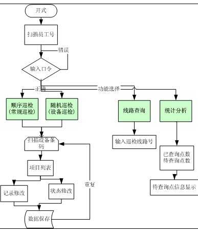 軟件功能 1、 采集巡檢人員的工作信息。 掃描巡檢人員ID,自動記錄為本次巡檢人 2、 查詢、打印巡檢人員、巡檢點、巡檢線路、設備巡鍵情況。 可查詢本次巡檢人員、巡檢點、巡檢線路 3、 設備巡檢 可分為正常巡檢和隨機巡檢。 正常巡檢要求嚴格按巡檢順序執行,遇錯則報警。統計漏檢信息。 隨機巡檢更該巡檢順序,不統計漏檢信息。 重復掃描自動報警。 界面參照下圖: