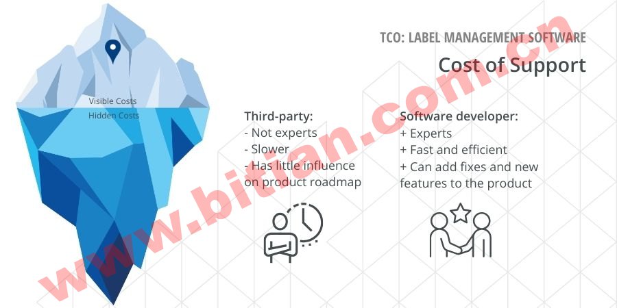 TCO 是解決方案在其生命周期內的總成本。對于標簽管理解決方案,這包括軟件購買、實施成本、持續支持成本和持續維護成本。大部分 TCO 由軟件供應商設置,例如相關服務的軟件價格和小時費率。一些 TCO 可能會受到買方的影響,包括勞動力成本、基礎設施成本和培訓成本。